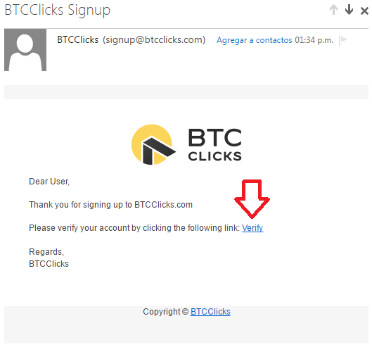 4. Debes revisar tu correo y buscar el mensaje de verificaci�n que es similar a la siguiente imagen y hacer click en el Link Verify como lo indica en la siguiente Imagen.