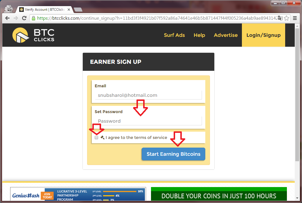 5. Por ultimo ser�s enviado a una web donde escribir�s la clave que quieren que tenga tu cuenta de BTCClick y Aceptaras los t�rminos de uso y presionaras el bot�n �Start Earning Bitcoin� como lo indica en la siguiente imagen.