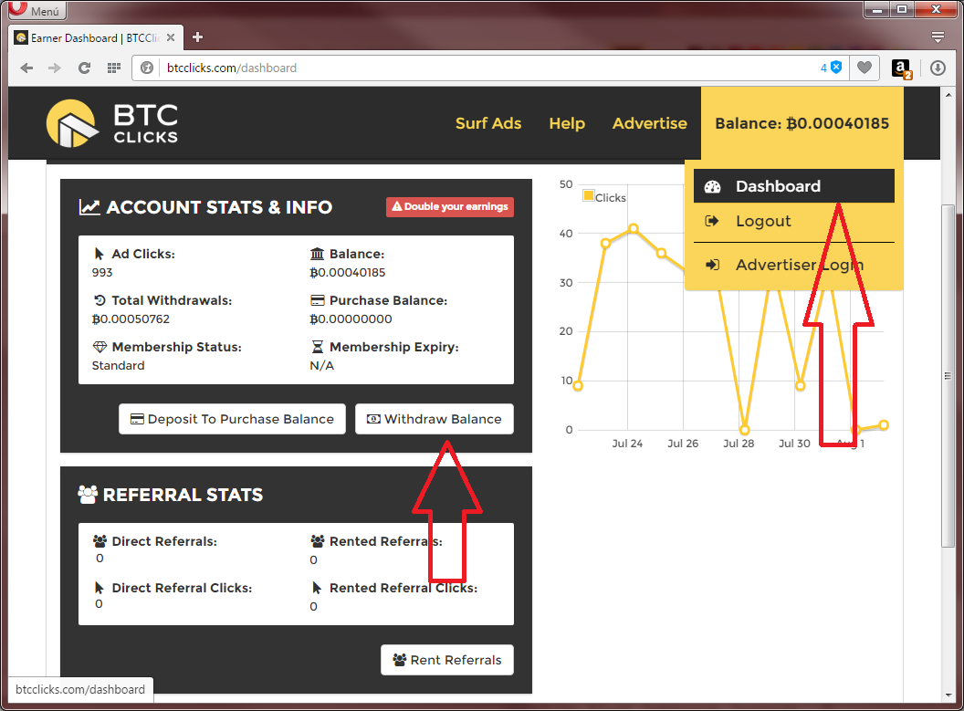 1. Ponga el puntero de mouse donde est� el Balance, y haga click sobre la opci�n Dashboard luego haga click sobre el bot�n que dice Withdraw Balance.
