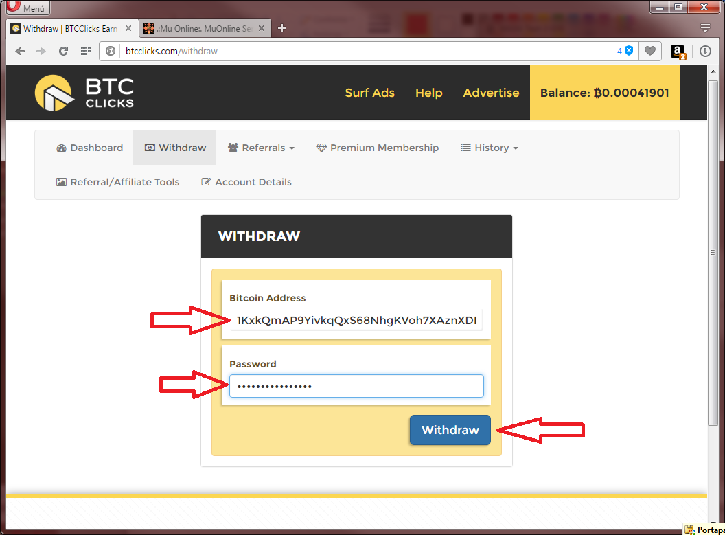 2. Escriba la direcci�n BTC donde indica la siguiente imagen y escriba su clave de btcclicks.com , para terminar haga click en el boton WithDraw y aprobar la transferencia.