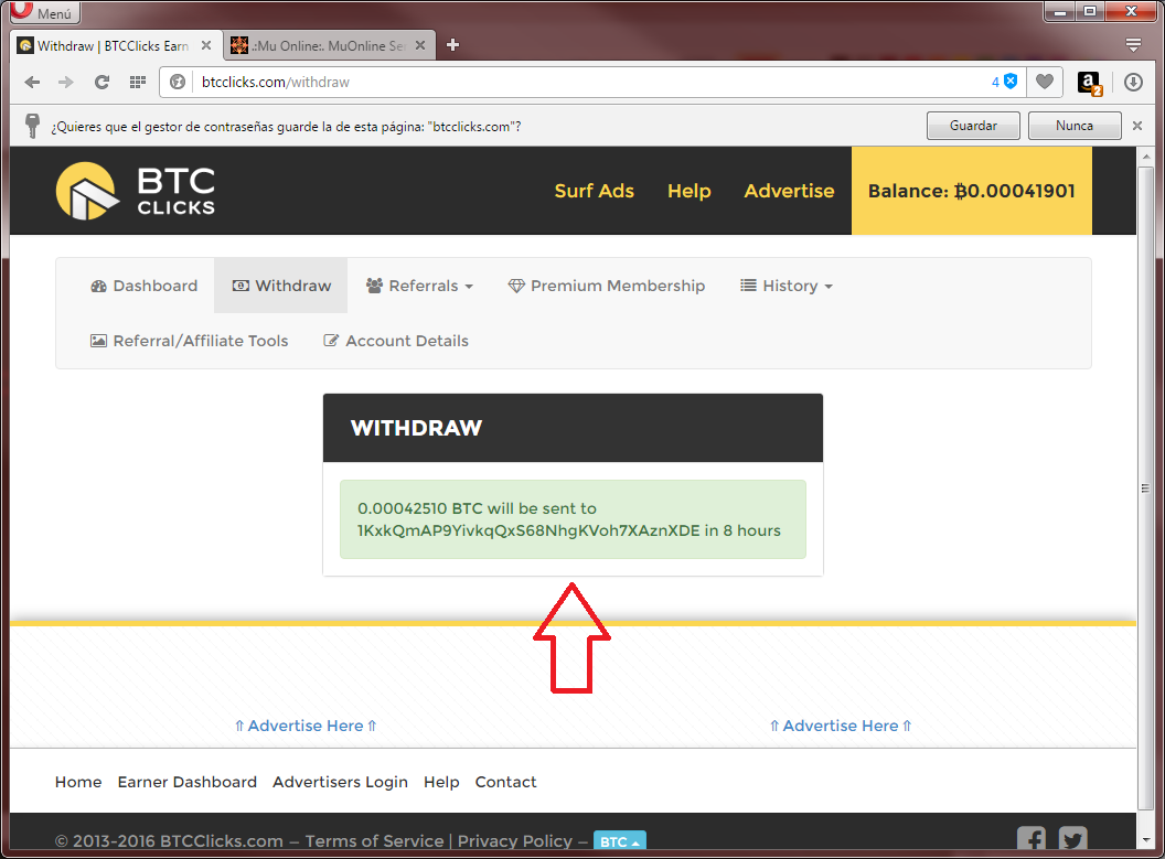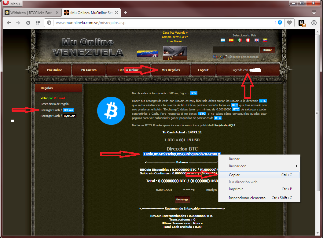 1. Debe buscar su propia direcci�n BTC en su cuenta de Mu Online, Vea la siguiente imagen.